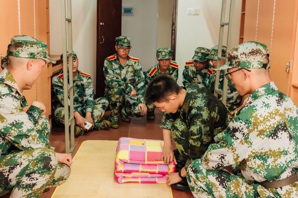格按照部的高准把自己的宿舍打造成示范宿舍。同,他亲自上阵,来到新生宿舍,向新生演示怎样叠出豆腐块叠被,要三折四叠。叠完被子后被子的边边角角行修整,才能真正叠好被。 彭达叠被子向新生道。